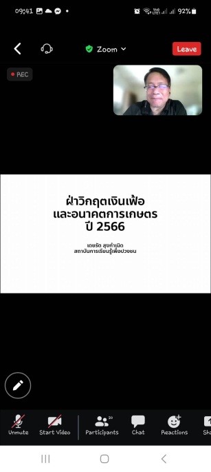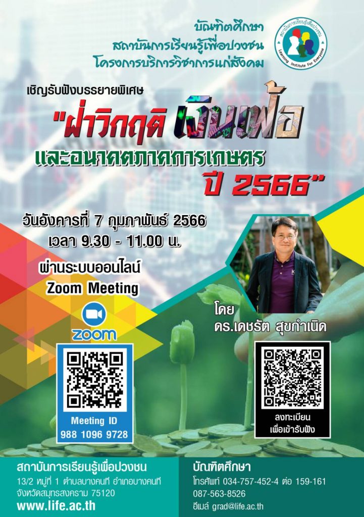 ด้วยบัณฑิตศึกษา สถาบันการเรียนรู้เพื่อปวงชน ได้จัดทำโครงการบริการวิชาการแก่สังคม “ฝ่าวิกฤติเงินเฟ้อและอนาคตภาคเกษตร ปี 2566” ถือเป็นภารกิจหลักที่สำคัญของบัณฑิตศึกษา เป็นการให้บริการวิชาการแก่สังคมที่มีการบูรณาการร่วมกับการเรียนการสอนและการวิจัย และบริการวิชาการแก่ชุมชน สังคม โดยมีอาจารย์ ดร. เดชรัต สุขกำเนิด อาจารย์ประจำหลักสูตรฯ บัณฑิตศึกษา สถาบันการเรียนรู้เพื่อปวงชน ในวันอังคารที่ 7 กุมภาพันธ์ 2566 โดยผ่านระบบ ZOOM ในการการจัดโครงการบริการวิชาการในครั้งนี้ มีกลุ่มเป้าหมายเป็นอาจารย์ นักศึกษา บุคลากร ศิษย์เก่าและบุคคลทั่วไปที่สนใจ จำนวน 40 คน