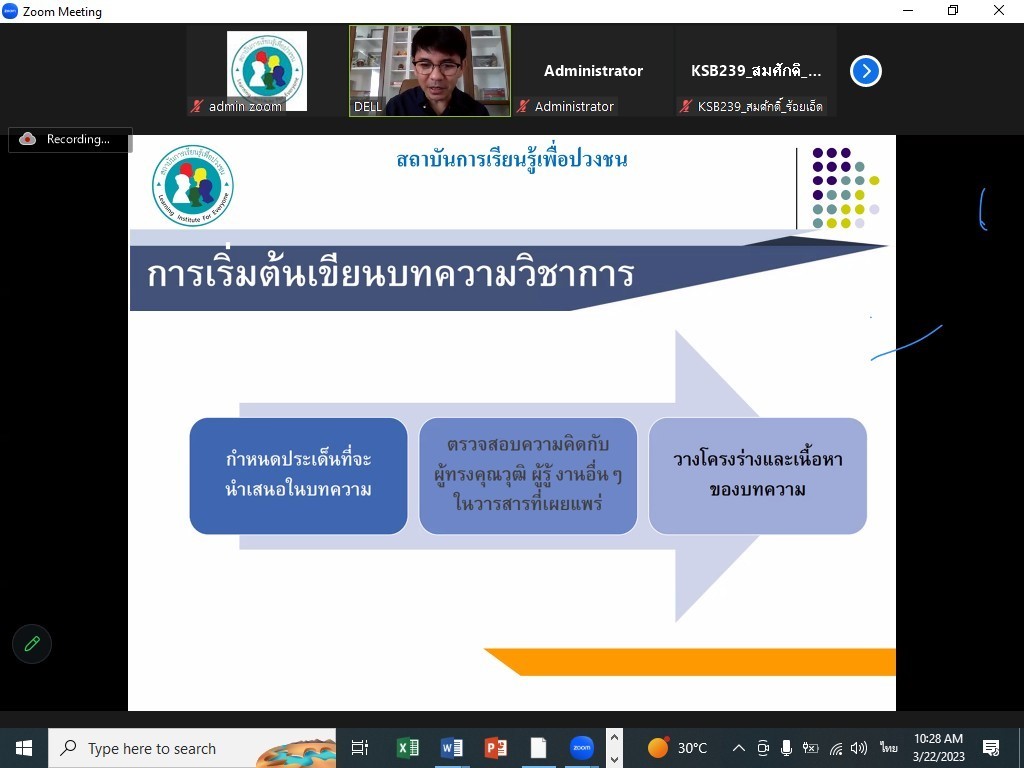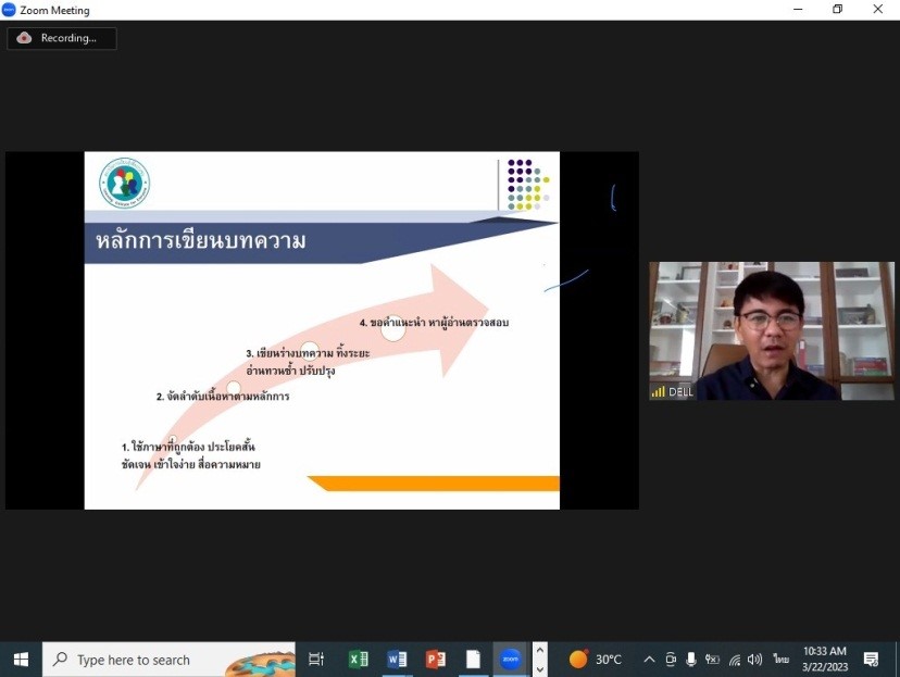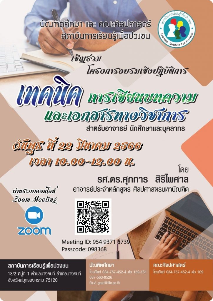 บัณฑิตศึกษา และคณะศิลปะศาสตร์ สถาบันการเรียนรู้เพื่อปวงชน ได้จัด”โครงการอบรมเชิงปฏิบัติการเทคนิคการเขียนบทความและเอกสารทางวิชาการ” สำหรับอาจารย์ นักศึกษา และบุคลากร เมื่อวันพุธที่ 22 มีนาคม 2566 เวลา 10.00-12.00 น. วิทยากรบรรยายโดย รองศาสตราจารย์ ดร. ศุภการ สิริไพศาล รองอธิการบดี ฝ่ายวิชาการ และอาจารย์ประจำหลักสูตรศิลปศาสตรมหาบัณฑิต ผ่านระบบออนไลน์ Zoom Meeting เพื่อสร้างความรู้ความเข้าใจในหลักการ องค์ประกอบการเขียนบทความวิชาการและบทความวิจัย ตัวอย่าง บทความวิชาการและบทความวิจัย และการตีพิมพ์บทความ เป็นการสร้างแรงบันดาลใจในการเขียนบทความวิชาการและบทความวิจัยให้กับอาจารย์ บุคลากรสายสนับสนุนและนักศึกษาระดับปริญญาตรีและปริญญาโท